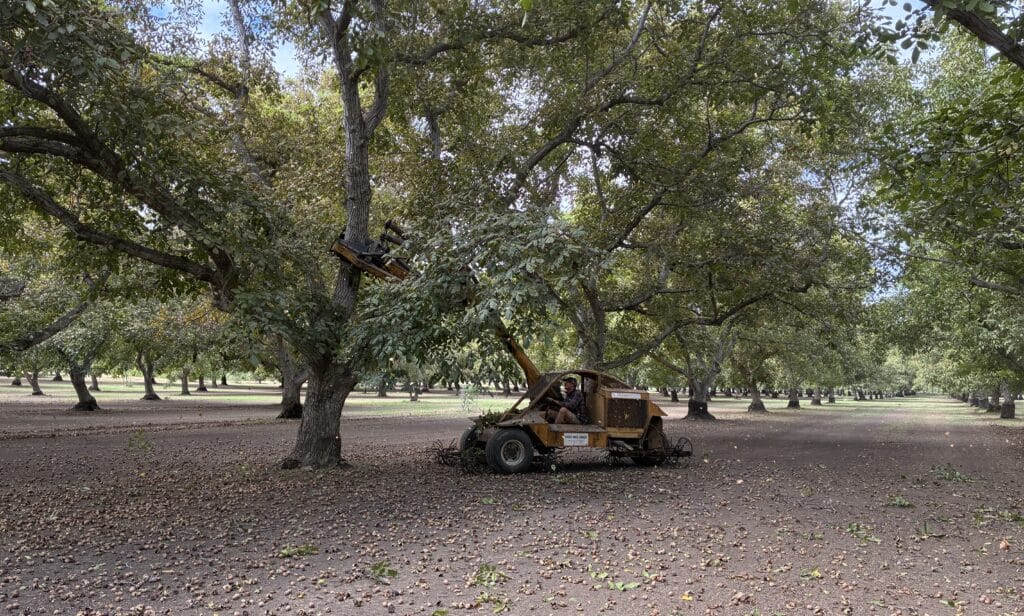 Our walnuts were shaken off the tree (thanks Paul and Amon!), swept up, and trucked off to be hulled right before it rained. You can see a video of the shaker below and learn more about the sweeper and other walnut harvesting equipment here. The video is deceptive; especially on the bigger trees, it looks like the shaker barely moves them. As you can see, plenty of nuts are falling and if you’re standing near the machine, or you’re in a nearby building, the ground shakes! It also is incredibly dusty and loud.