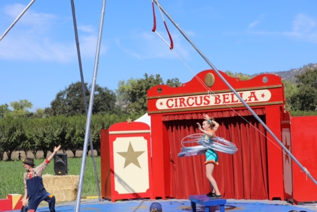 This is the 8th year that Circus Bella has come to the Hoes Down. They arrive on Thursday evening for a farm spaghetti dinner, perform a whole district show for the Esparto School District – 300 children from kindergartners to seniors in high school are entertained with live performance of circus… magical – 3 shows at the festival and a packed crowd for each. They are wonderful folks who understand the simple act of performance in an old format- displaying strength, grace, clowning, juggling, multigenerational art and skill and twirling children on ones feet.