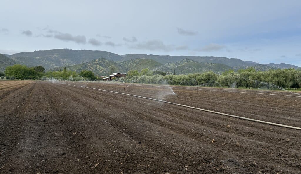 That being said, average rainfall for Guinda is about 22 inches a year, and despite the rain-free March, that’s about where we’re at for this rainy season. Statewide, snowpack levels are below normal, but our surfacewater source, Cache Creek, comes from Clearlake and Indian Valley Reservoir, which are both rain-fed, not dependent on snow. In a normal year, we use surface water from Cache Creek from April to October, constituting about 2/3 of our annual water use. We use groundwater pumped up via wells for fields that don’t have access to the creek, and for periods of time when we can’t put a pump in the creek, including during extreme drought when there have been no releases of reservoir water in Cache Creek, as happened in 2022. When using groundwater, given the uncertainty of the amounts that we have to draw on, we are conservative about our use.