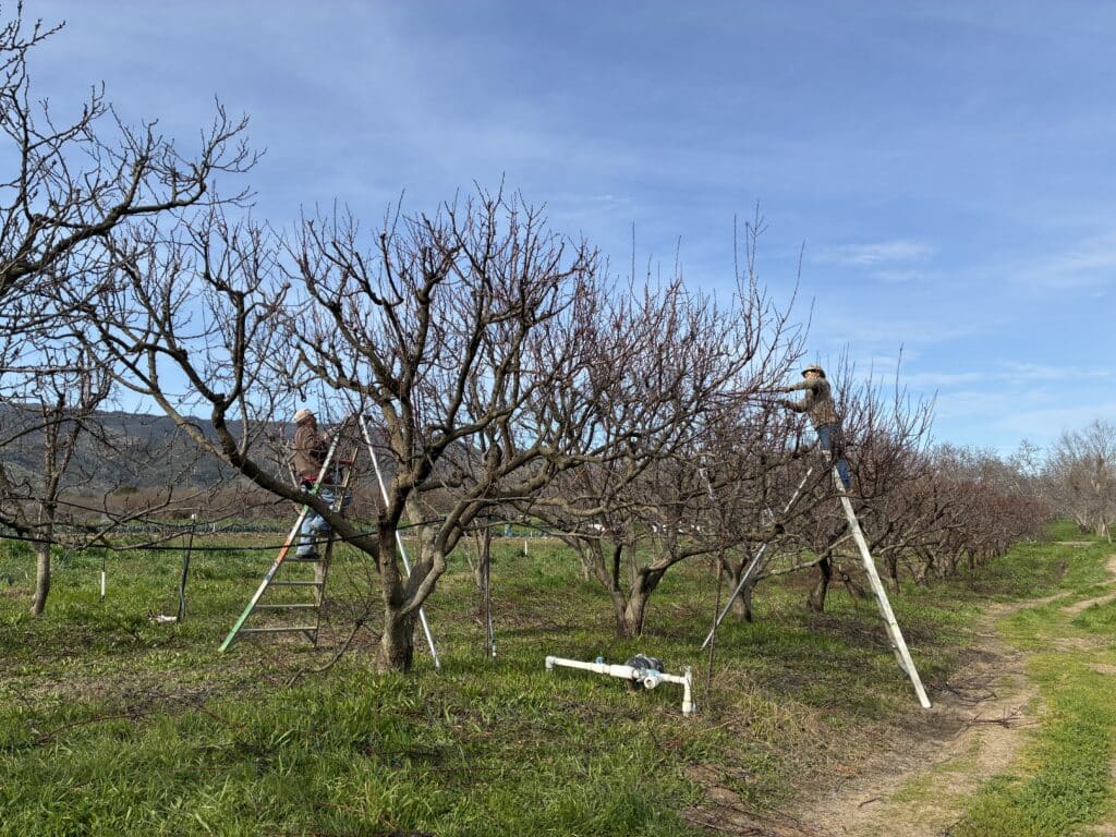 The fruit team was hard at work picking navel oranges and pruning trees. This is the time of year to prune most deciduous fruit trees to stimulate growth and remove large branches. There’s an art to pruning and an ideal shape for each type of tree. For stone fruit, you want an open center, like a vase, to get light into the middle of the tree.