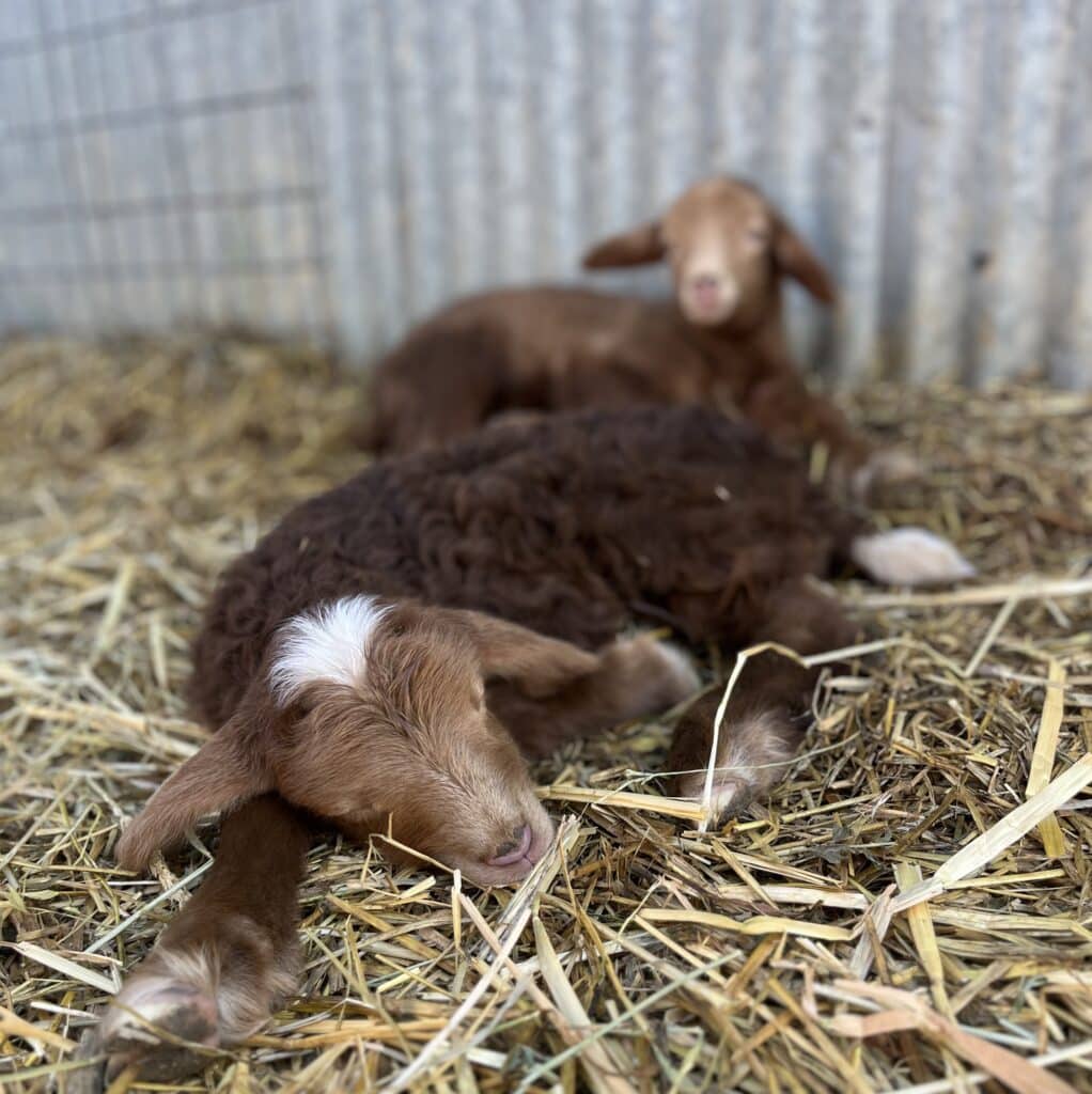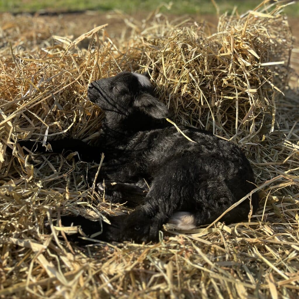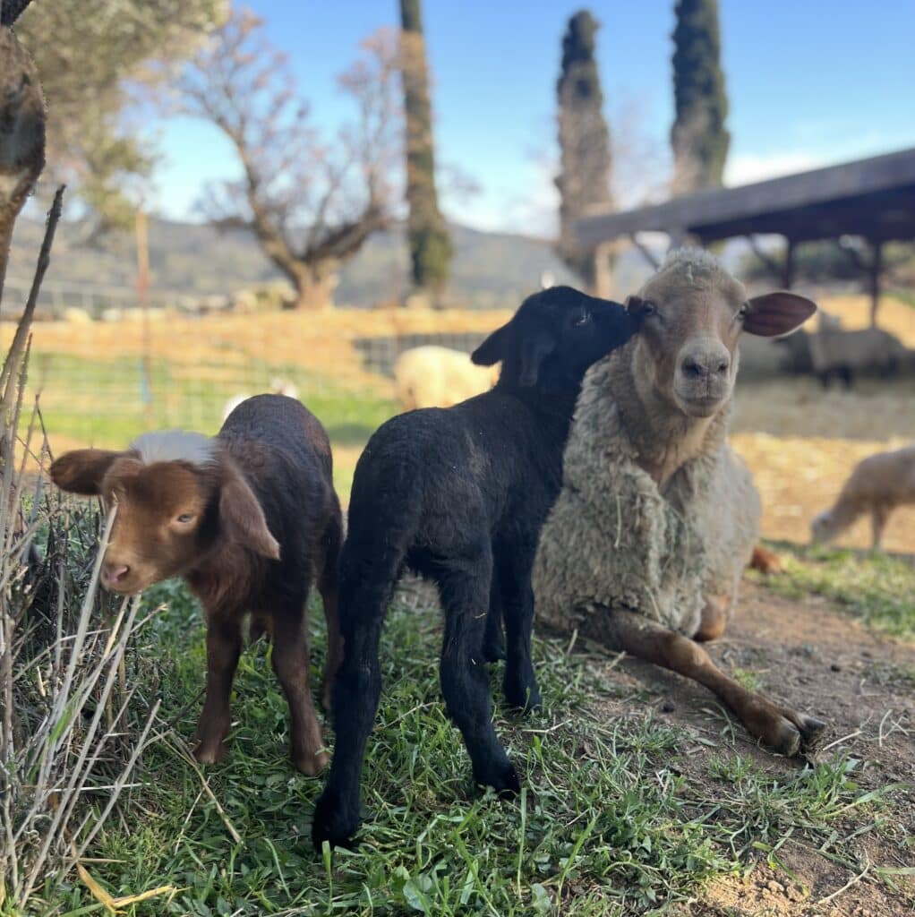 As for the lambs, we’re still waiting on a few ewes but most have given birth and we have over 160 lambs. This includes three “bummer lambs,” the term for orphaned or rejected lambs that need bottle-feeding. They’re currently being cared for by Rye and Becca’s family, and no exaggeration, the whole family is involved, from their youngest, Juno, to the family dog, Soba. Soba and the “driveway bummers” have formed quite the bond. They follow him everywhere and he faithfully guards them. These bummer lambs will rejoin the rest of the group in May. Thanks to Becca for the photos!