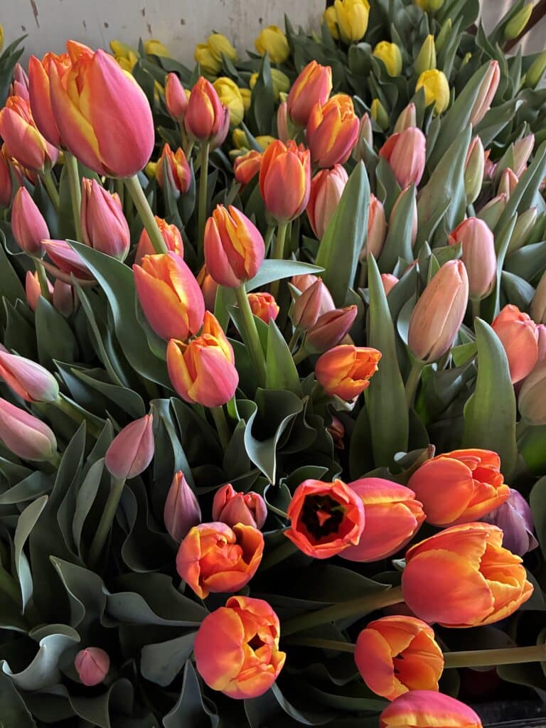 Harvesting tulips over the past two weeks in the rain, or in between the rain, has been a muddy affair, but the timing of harvest is important. We need to harvest before the flower opens so that each stem will be in bloom in your houses for the longest time possible. We pull the whole thing, bulb and all, from the ground, and we don’t save tulip bulbs between years. We can’t leave the bulbs in the ground – gopher predation and the bulbs need to be chilled pre-planting to get an even bloom. Even if we did save them, the old bulbs may not produce a flower and the stems might be short. That being said, we sometimes still end up with short tulips from new bulbs. So we compost the old bulbs and buy and plant a new set each year. The flower team has also been harvesting some stunning anemones!